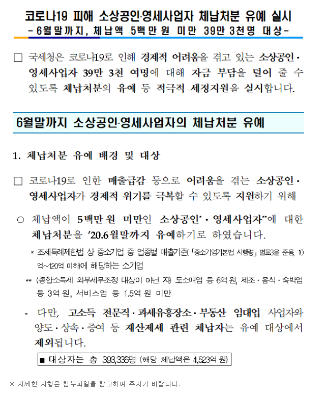 코로나19 피해 소상공인・영세사업자 체납처분 유예 실시