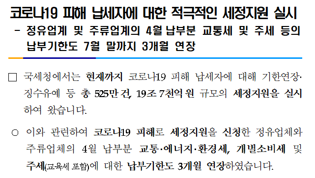 코로나19 피해 납세자에 대한 적극적인 세정지원 실시