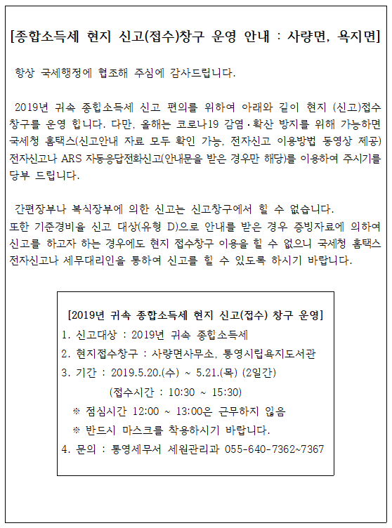 [종합소득세 현지 신고(접수)창구 운영 안내 : 사량면, 욕지면]
