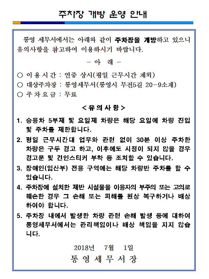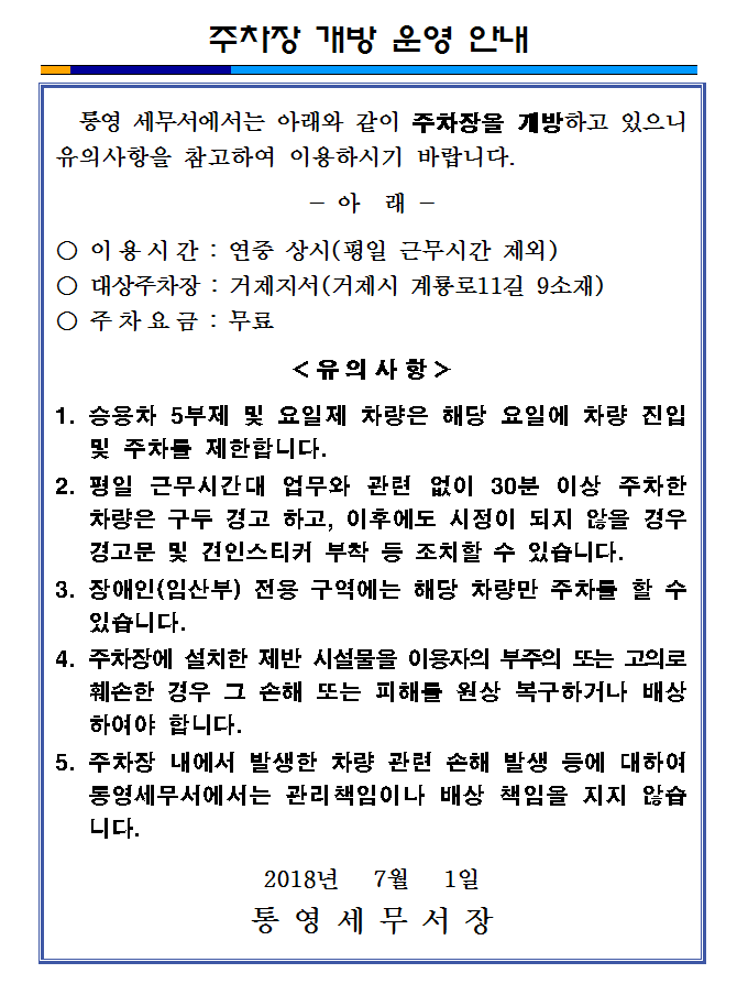 안녕하십니까. 통영세무서 입니다. 통영세무서 및 거제지서의 공공자원(주차장) 개방 운영 안내를 아래와 같이 안내드립니다. 통