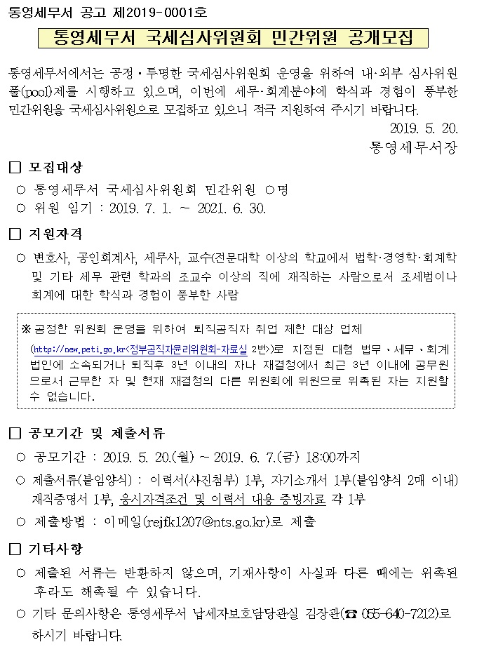 국세심사위원회 모집 공고(통영세무서 공고 제2019-1호)