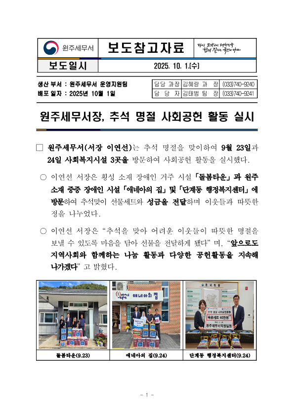 원주세무서장, 추석명절 사회공헌 활동 실시