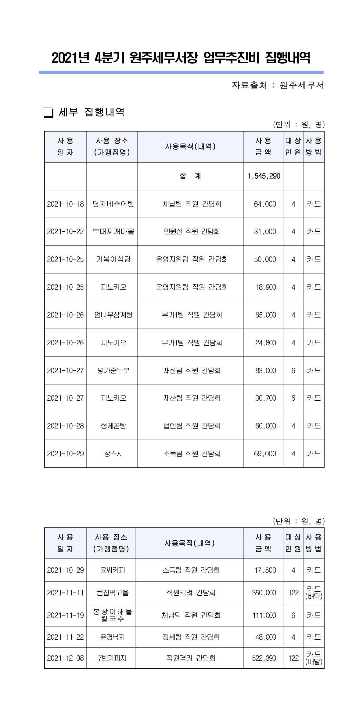 2021년 4분기 원주세무서장 업무추진비 집행내역