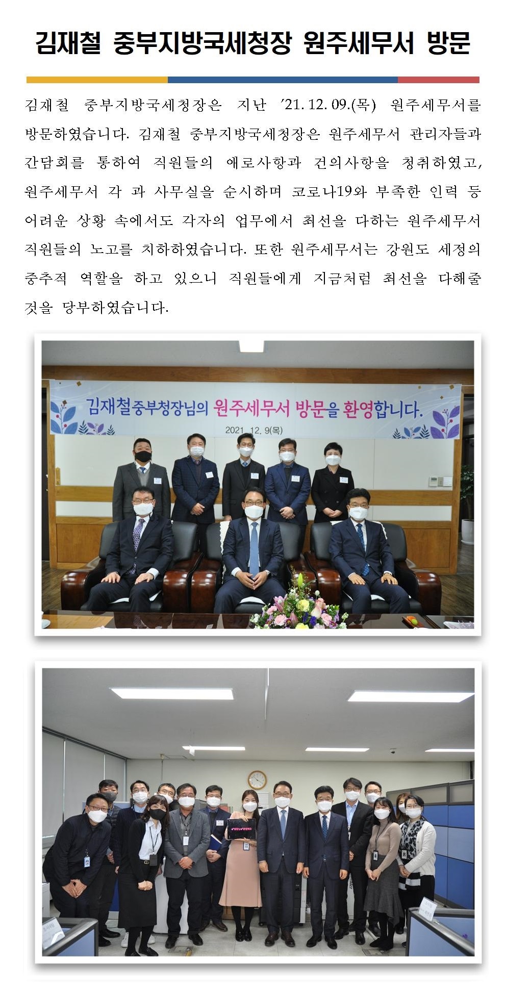 김재철 중부지방국세청장은 지난 ’21.12.09.(목) 원주세무서를 방문하였습니다.