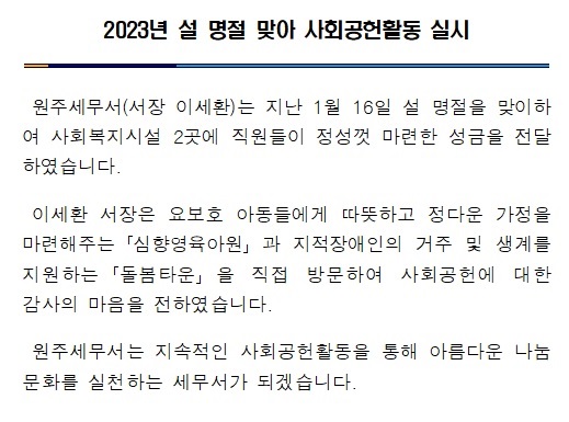 원주세무서, 2023년 설 명절 맞아 사회공헌활동 실시