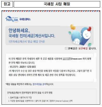 최근 국세청을 사칭하여 ‘전자세금계산서 발급 메일 안내’라는 제목의 메일이 발송되어