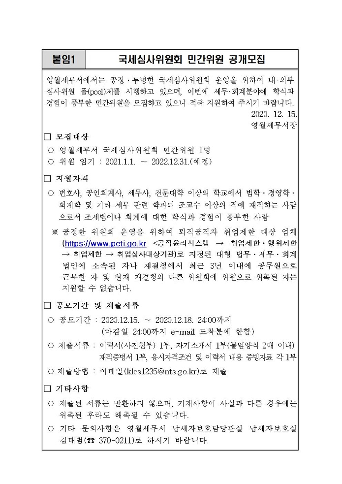 국세심사위원회 민간위원 공개모집